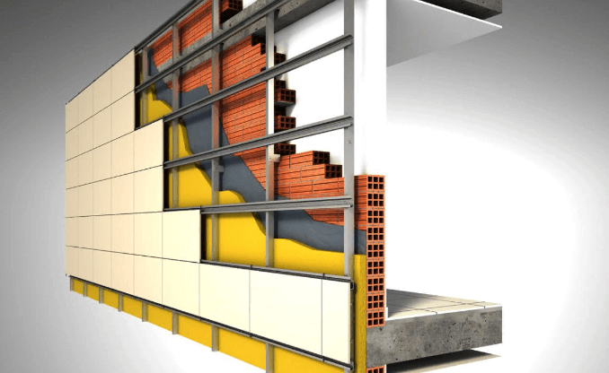 Еще его называют навесной фасад. Конструкция состоит из несущих профилей, которые крепятся на определенном расстоянии от стены, таким образом формируется зазор. Эта прослойка позволяет хорошо вентилировать нижерасположенные элементы. Панели навешиваются поверх профилей. Они могут иметь разную геометрическую форму.