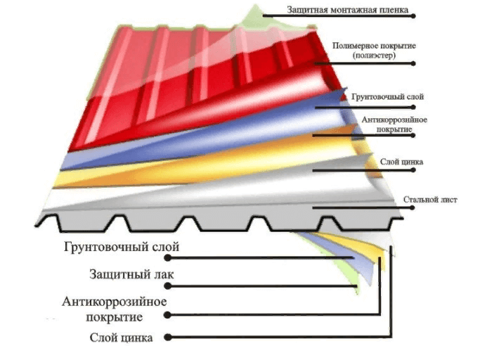 Рассматривая картинку ниже, можно увидеть, что профилированный лист изготавливается из нескольких слоев разный материалов. Пристальное внимание в этом разделе статьи будет направлено финишному покрытию. Этот слой выполняет сразу два назначения – декоративное и защитное. Благодаря применению разных цветовых решений, профлист может изготавливаться любой цветовой гаммой.