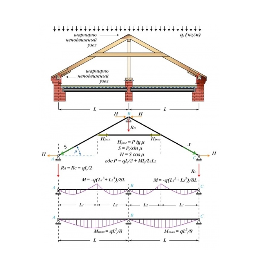 Несущие конструкции крыши частного дома обычно выполняются из деревянных балок или досок. Чтобы воспринимать все усилия кровельного материала, создается сразу три точки опоры. Промежуточные опоры устанавливаются только в тех постройках, которые имеют капитальные внутренние стены. Их количество определяется на основании пролета. Конструкция крыши в домах с поперечным размером до 10 м предусматривает только одну подпорную стойку. Более длинные пролеты требуют дополнительных опор.