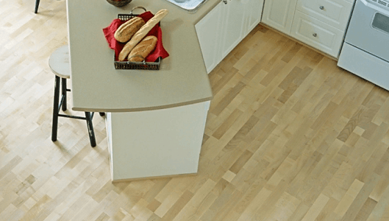 Подобный пол лучше всего применять только в месте, отведенном под столовую. Зоны, которые подвергаются высокой нагрузке выкладываются из более прочного материала. Идеальным решением выступает плитка для пола в кухне. Такое решение необходимо брать во внимание потому, что древесина не терпит постоянного контакта с водой и регулярных перепадов температуры. Прочность дереву добавляют специальные составы, которые наносятся поверх финишного покрытия.