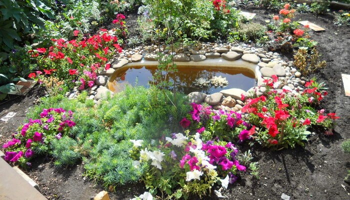 По периметру выкладываются камни, которые будут защищать водоем от попадания в него земли. Дно устилается щебнем, чтобы создать красивый внешний вид. По краям и углам расставляются декоративные растения.